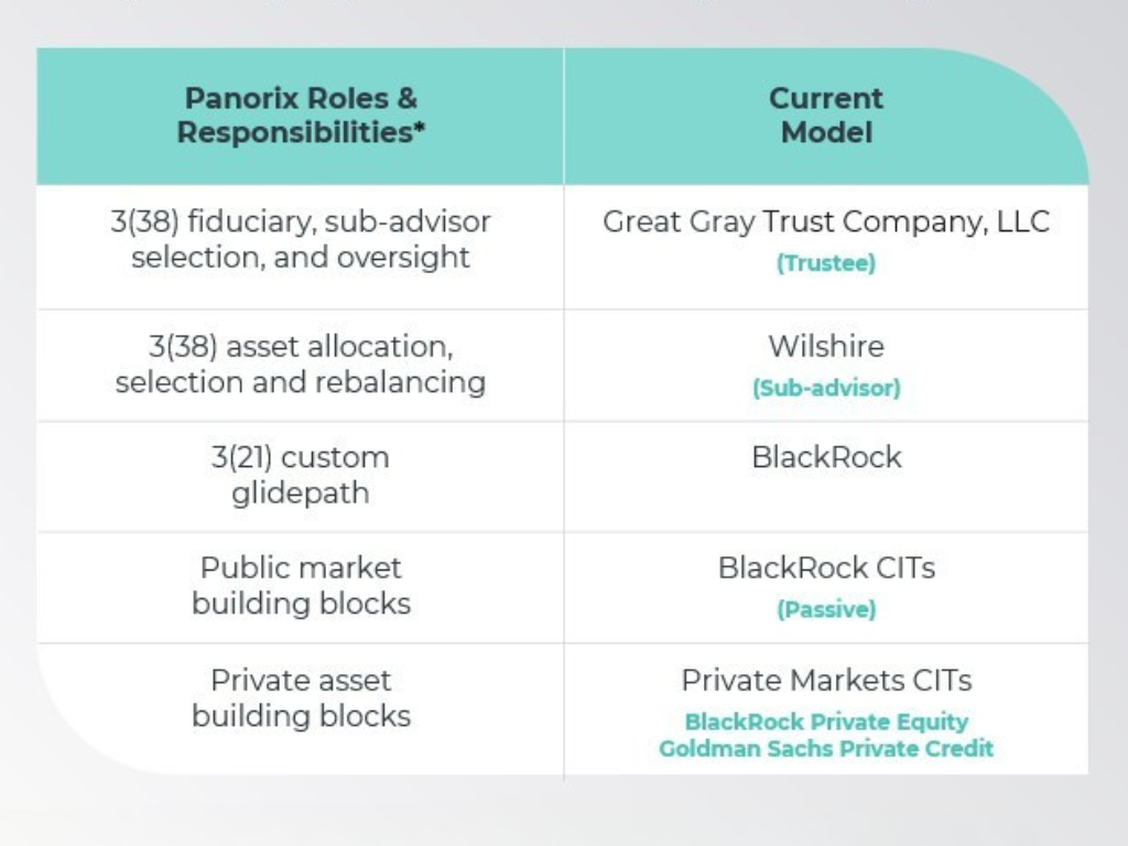 BlackRock’s index (equity and fixed income) and private equity offerings have also been selected as investment components in the solution. For the private equity component, Great Gray has created a CIT that will invest mostly in BlackRock’s BPIF fund – BlackRock Private Investments Fund – which is designed to deliver a diverse, core portfolio of institutional private equity in an evergreen, registered interval fund structure. BPIF had $366.8 million AUM as of 6/30/25. The CIT will also have a BlackRock-managed liquidity sleeve to help manage asset flows.